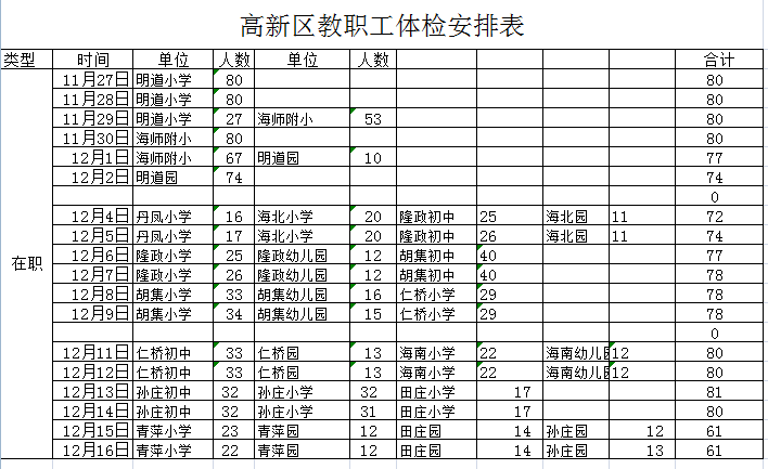 高新区教职工体检安排表 来源: 发布时间:2017-11-03 00:00:00 浏览次数: 次 【字体:小 大】 高新区教职工体检安排表 文章来源: 发布时间:2017年11月03日 点击数: 次 字体:小 大 [打印文章] [添加收藏] 更多 上一篇:关于做好教职工体检工作的通知[ 11-03 ] 下一篇:田庄小学2017下半年第11周工作安排[ 11-06 ] 分享到: 【打印正文】