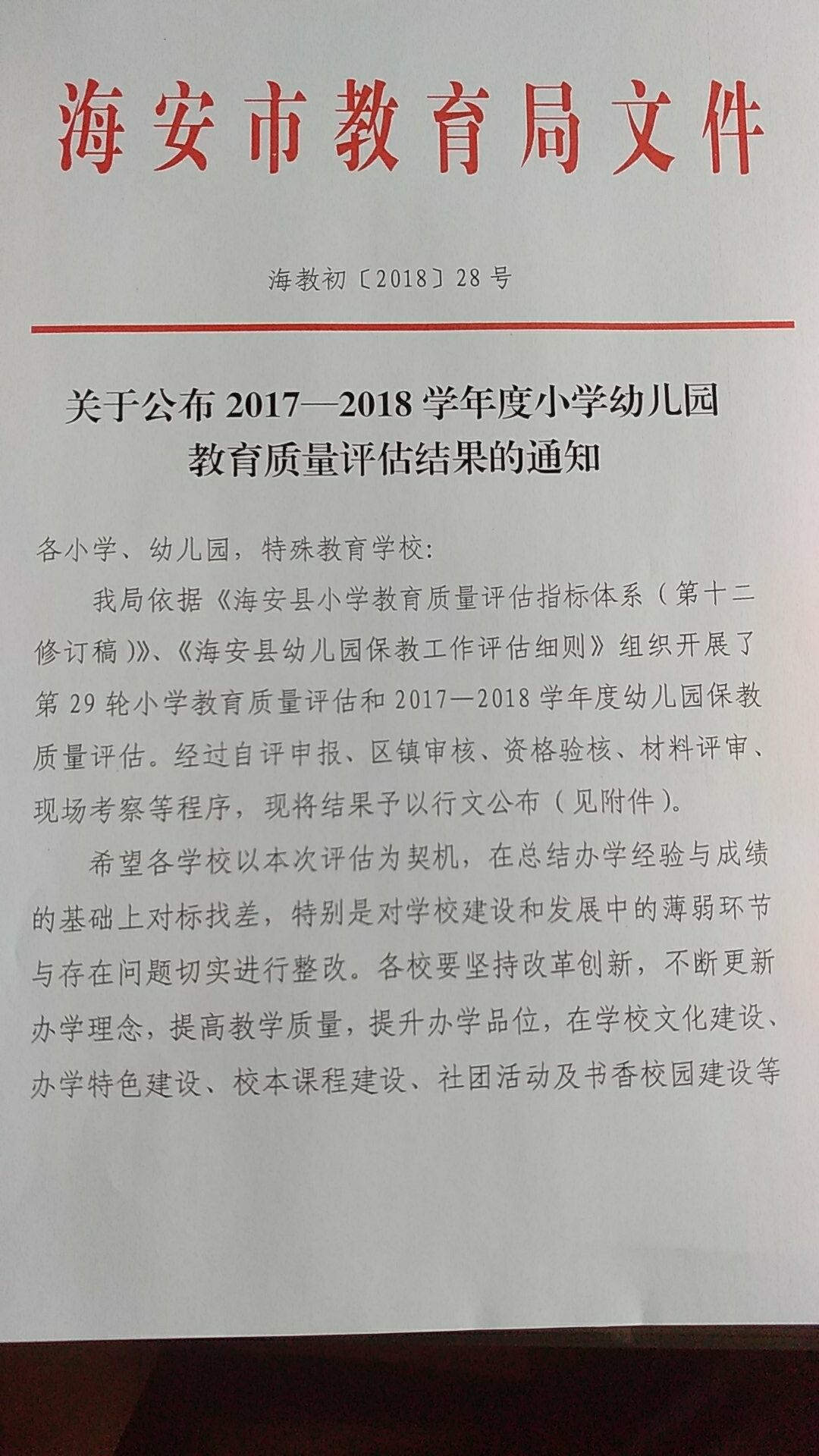 关于公布2017-2018学年小学幼儿园教育质量评估结果的通知(海教初201828号)