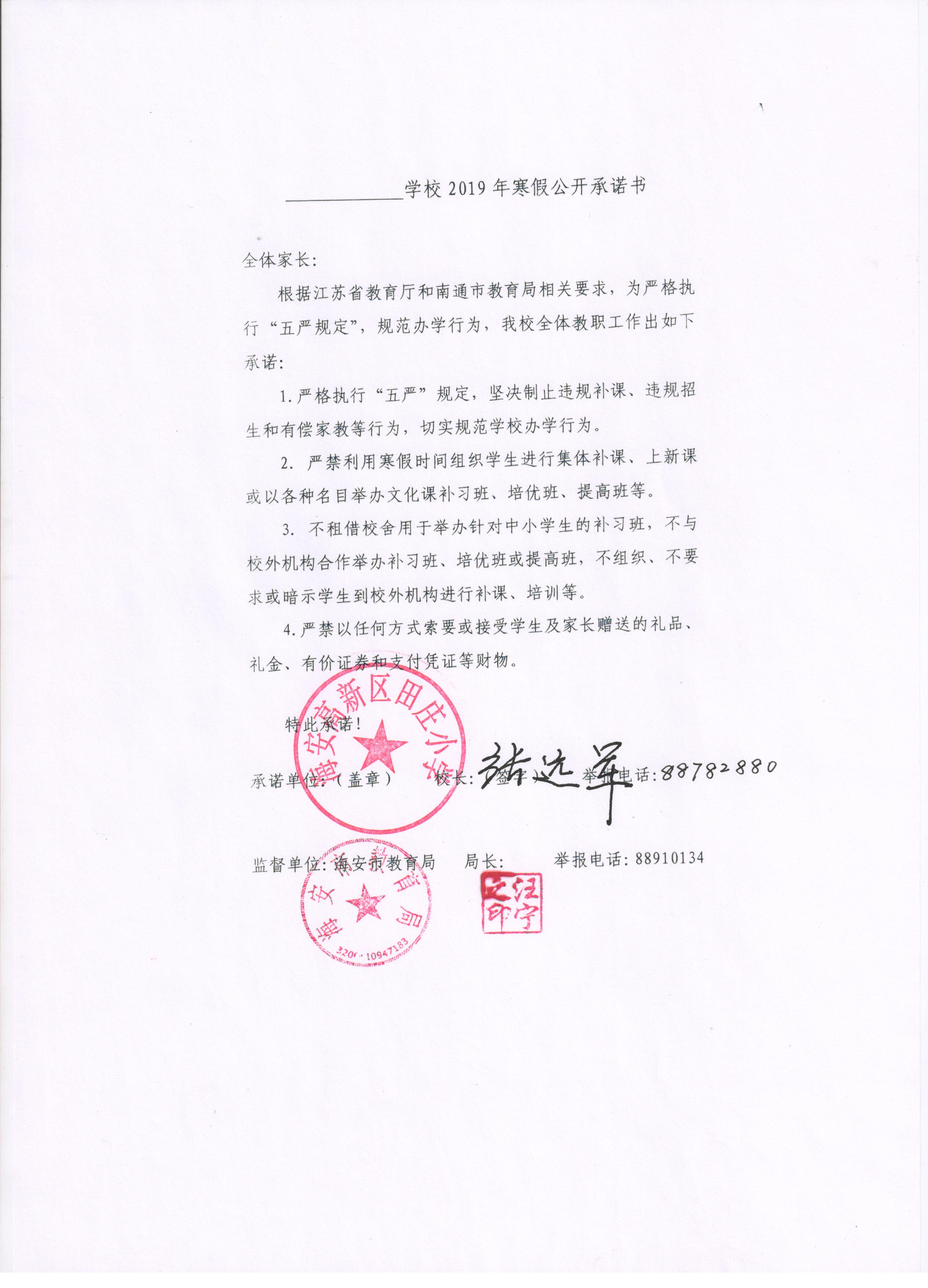 2019年寒假公开承诺书 来源: 发布时间:2019-01-21 00:00:00 浏览次数: 次 【字体:小 大】 2019年寒假公开承诺书 文章来源:田庄小学 发布时间:2019年01月21日 点击数: 次 字体:小 大 [打印文章] [添加收藏] 更多 上一篇:田庄小学开展农村环境整治专项行动宣传活动[ 01-15 ] 下一篇:高新区田庄小学举行新学期开学典礼[ 02-19 ] 分享到: 【打印正文】