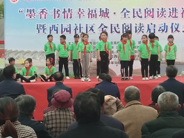 4月23日下午,由海安市委宣传部、高新区党工委、管委会、园庄办事处、西园社区以及田庄小学联合举办的“墨香书情幸福城,全民阅读进社区暨西园社区全民阅读启动仪式”在高新区西园社区举行,田庄小学部分师生应邀参加并进行了精彩的节目表演。