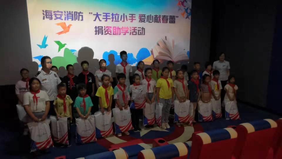9月9日下午,海安消防大队会同高新区妇联负责人来到海安高新区田庄小学,看望并慰问“春蕾班”的孩子。领导们亲切询问部分学生学习生活情况,带领全班学生观看电影《烈火英雄》,并为他们送上书包、文具盒及助学金等。
