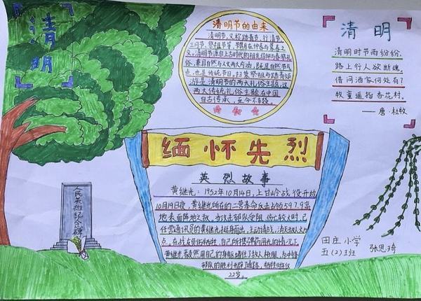 学校少先队大队部提前发出号召,让队员们搜集资料,了解清明节的由来、文化内涵、有关的传说以及清明的习俗,从中感受到中华民族文化的魅力与丰富内涵,增加学生的文化知识和对祖国的热爱之情。队员们通过制作手抄报、绘画、分享英烈们的英勇事迹等形式表达了对英雄们的崇敬和缅怀。