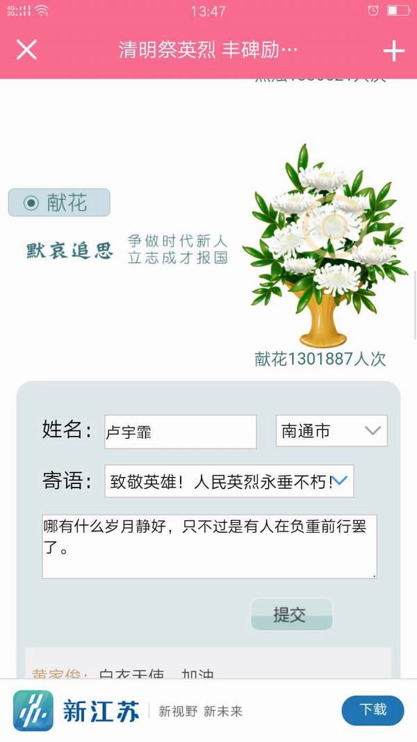 由于疫情影响,学校因地制宜组织学生参加“网上祭英烈”活动。队员们通过网络了解先烈事迹,在平台上献花、留言,悼念革命先烈,致敬抗疫英雄。“哪有什么岁月静好,只不过有人替你负重前行罢了。”卢宇霏同学满含热泪地写下了这样一句话。这位年前回到湖北襄阳直到3月21日才返回海安的小姑娘,切身感受到了抗疫一线人员的辛苦,用文字表达了对英雄的感恩。