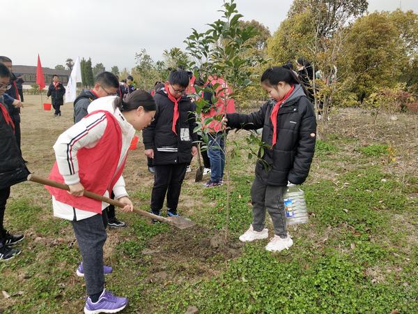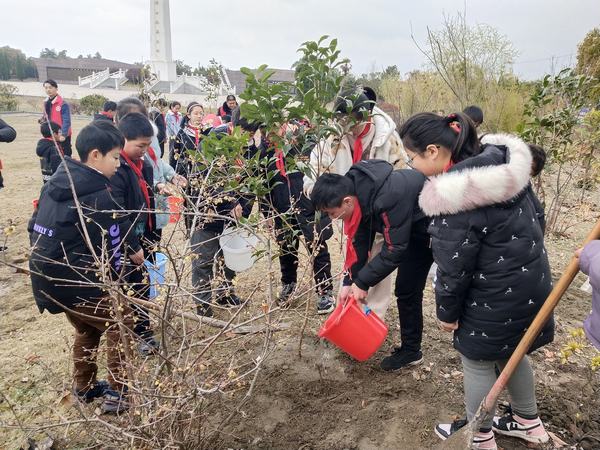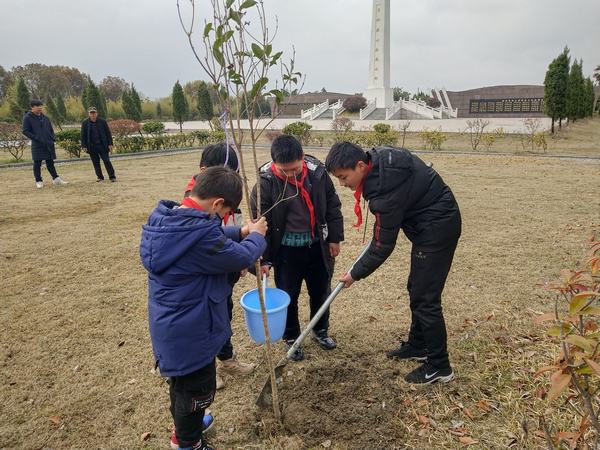 活动当天,队员们佩戴着鲜艳的红领巾来到烈士陵园。活动前,田庄小学校长张远军进行了简短的动员讲话。“大家栽树时,树苗一定要扶正,根部的土千万不能压了根茎,栽好后浇水施肥要均匀一些,这样小树才能吸收更多的营养。”队员们在老师们的指导和示范下,很快就学会了回填和覆土的正确方法。挖坑植树、挥锹培土、扶苗浇水、施肥增养,大家干得热火朝天。队员们不怕辛苦,团结互助,劳动热情高涨。一时间,人影、树影交织成一幅幅生动的画面。经过一个多小时的辛勤劳动,树苗迎风挺立,生机盎然。