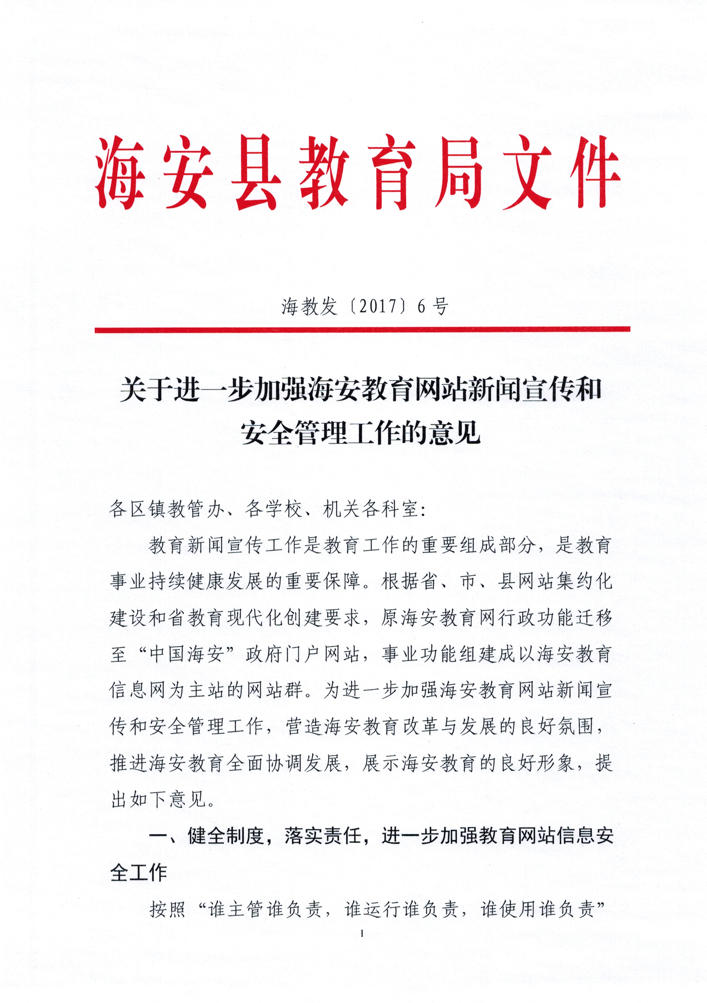 关于进一步加强海安教育网站新闻宣传和安全管理工作的意见(扫描) 来源: 发布时间:2017-03-16 00:00:00 浏览次数: 次 【字体:小 大】 关于进一步加强海安教育网站新闻宣传和安全管理工作的意见(扫描) 文章来源: 发布时间:2017年03月16日 点击数: 次 字体:小 大 [打印文章] [添加收藏] 更多 上一篇:田庄小学教师专业发展规划[ 02-21 ] 下一篇:20170221关于进一步优化小学教育研究共同体建设的通知[ 03-16 ] 分享到: 【打印正文】