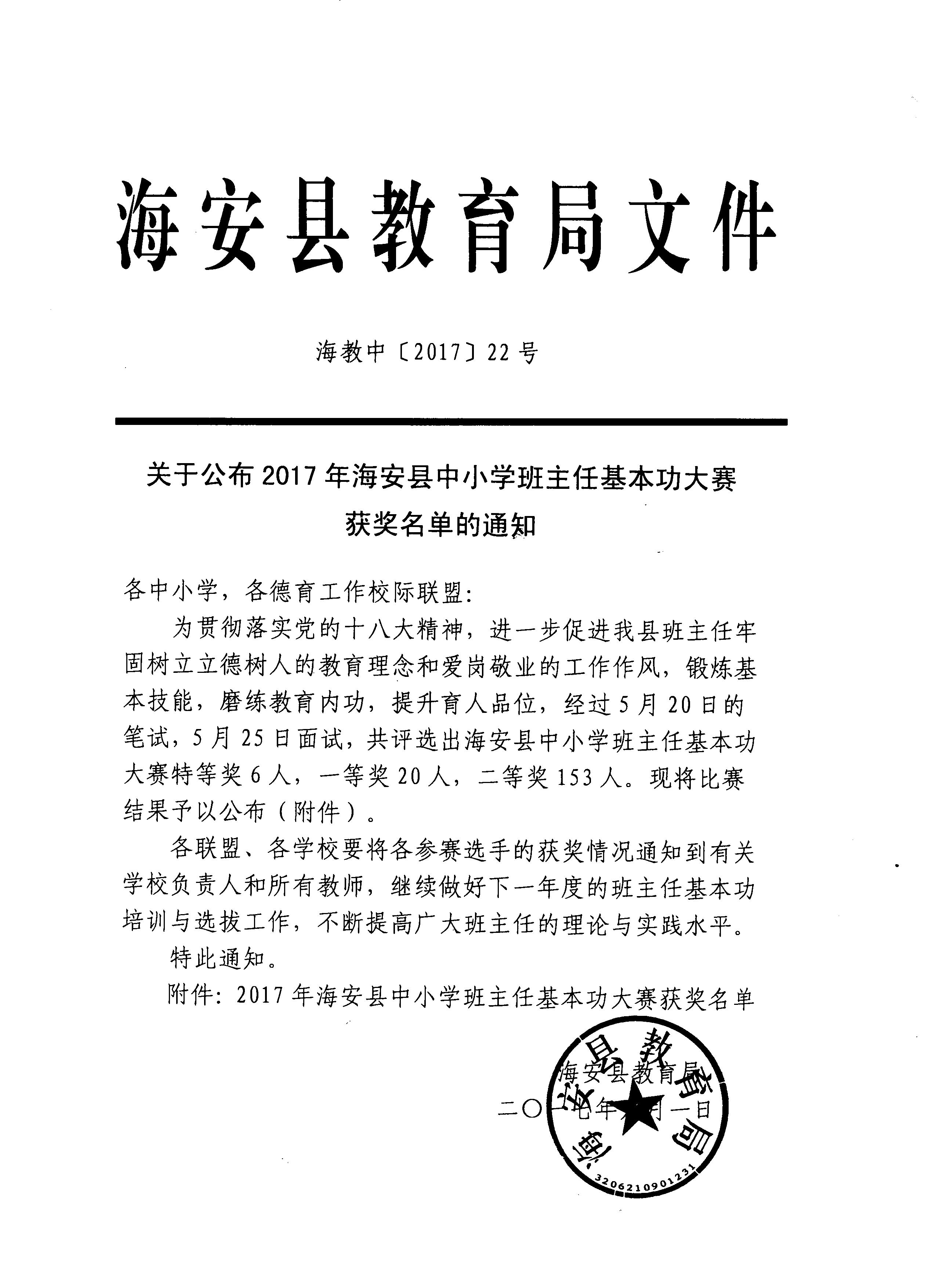关于公布2017年海安县中小学班主任基本功大赛获奖名单的通知